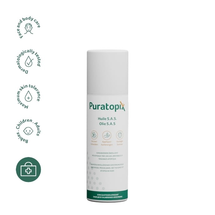 PURATOPIX OLIE SAS is een rijke verzachtende formule op basis van olie die vloeibaar is en daardoor makkelijker uit te smeren. . De vloeibare textuur is ideaal voor kinderen die de voorkeur geven aan vloeibare verzorging, voor behaarde zones en huidplooien, en voor mensen die een eenvoudig formaat wensen om hun huid de hele dag doeltreffend te beschermen.